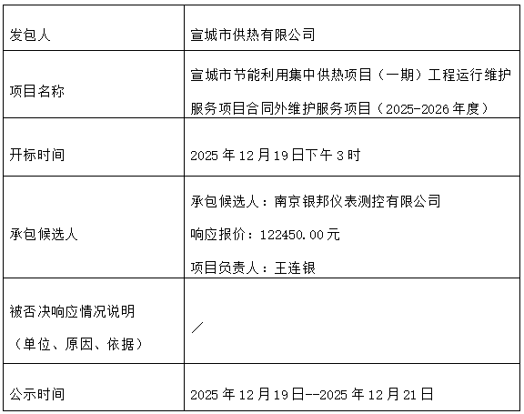 宣城市節(jié)能利用集中供熱項(xiàng)目(一期)工程運(yùn)行維護(hù)服務(wù)項(xiàng)目合同外維護(hù)服務(wù)項(xiàng)目(2025-2026年度)中標(biāo)結(jié)果公示