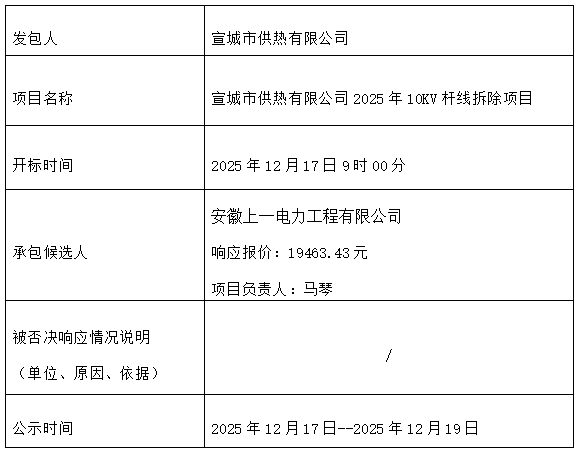 宣城市供熱有限公司2025年10KV桿線拆除項(xiàng)目結(jié)果公示